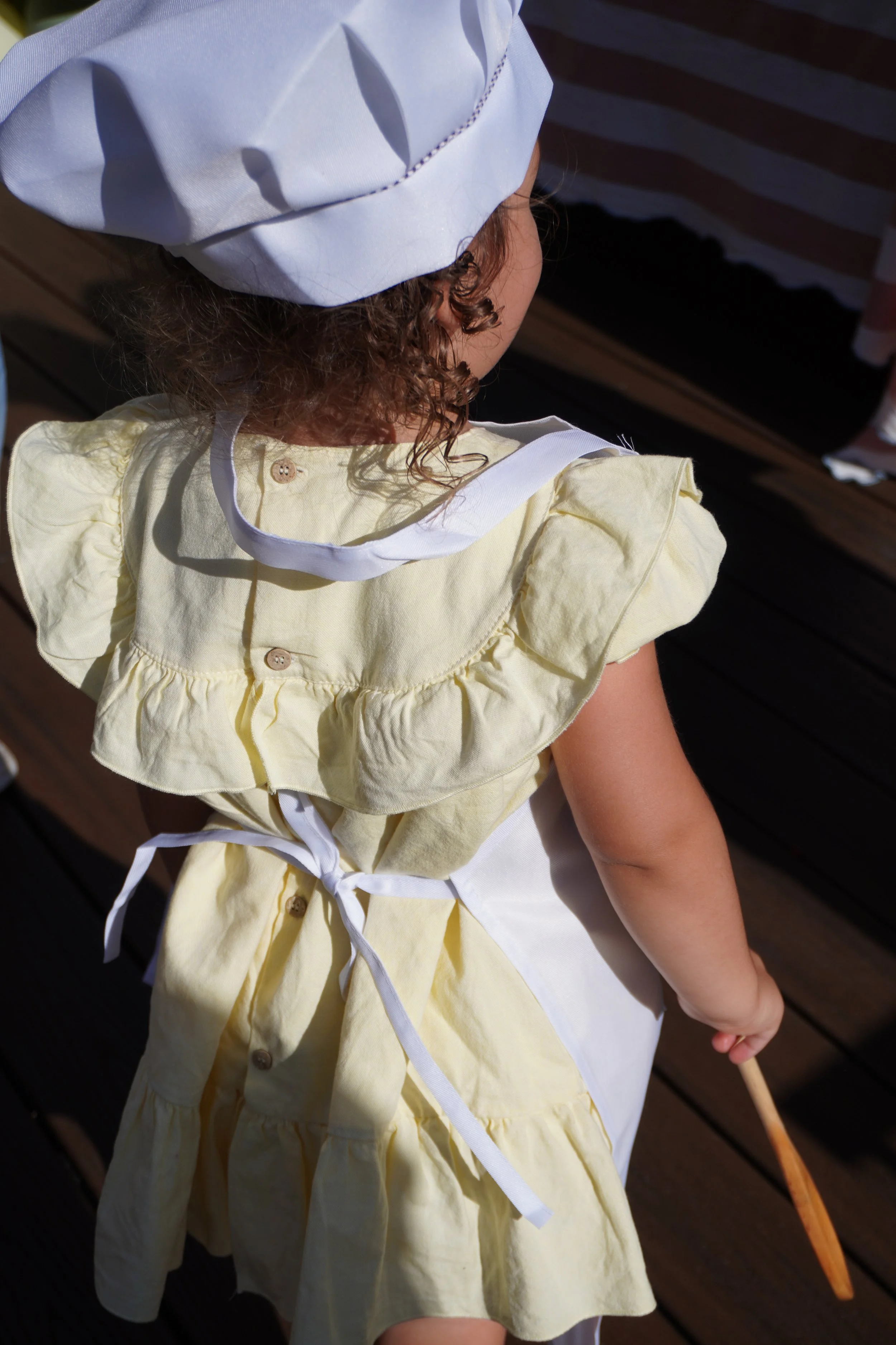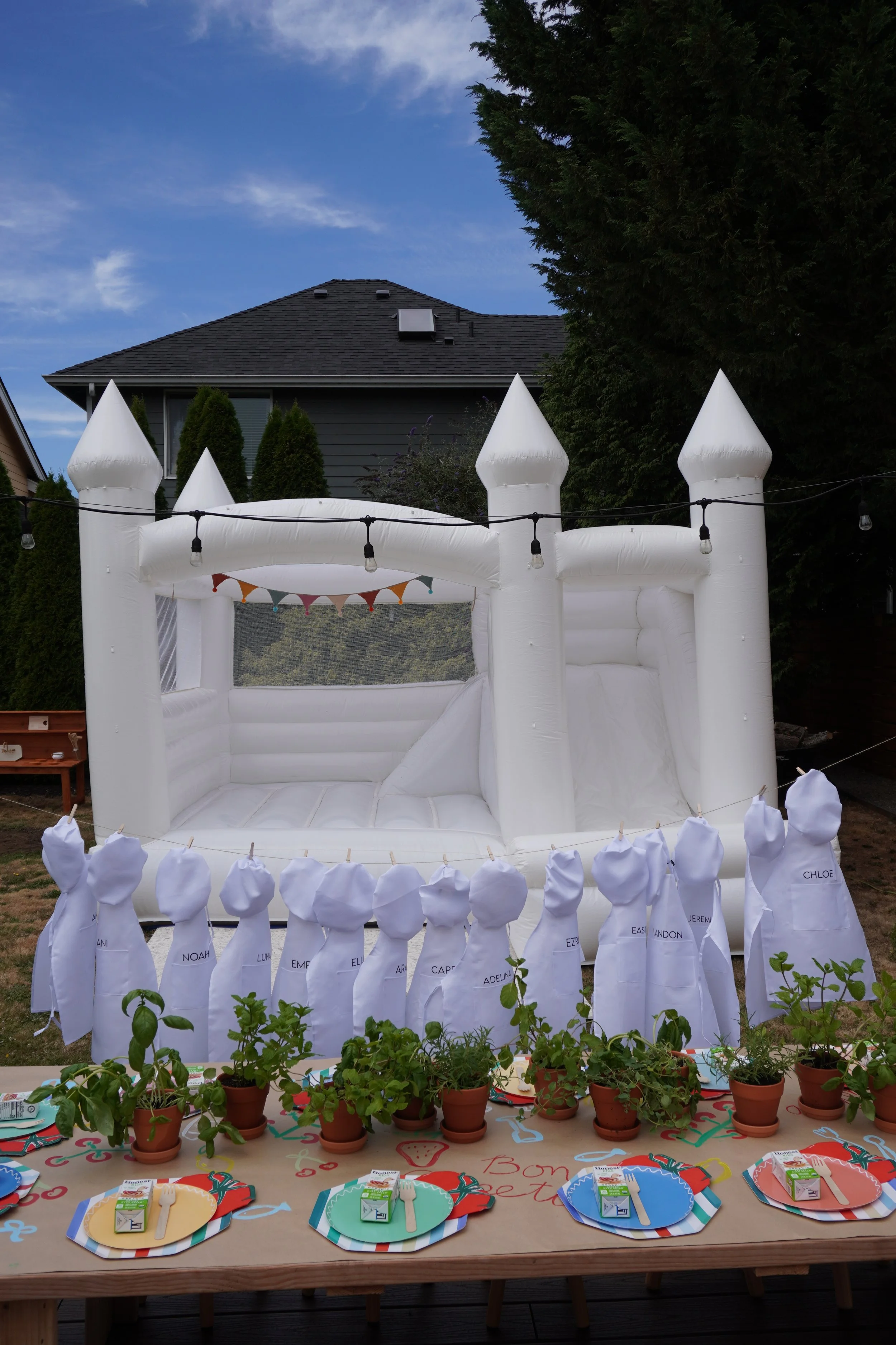 Brainstorming kids' activities and "goodie bags" is always so fun for me because I just love our community and want to thank our people for being a part of our baby's life on her special day too. I thought it would be so fun to see all the kids dressed up in their chef attire and also have something useful and special to take home which is what inspired the custom aprons. I did a craft paper table cloth that the kids could color during the party with pain pens and also had pots on the table with herbs they could decorate and bring home for their own kitchens. My husband and I even spent some time together building a mud kitchen for the kids to enjoy at the party and to be her birthday gift. I can guarantee a lot of love went into this party.