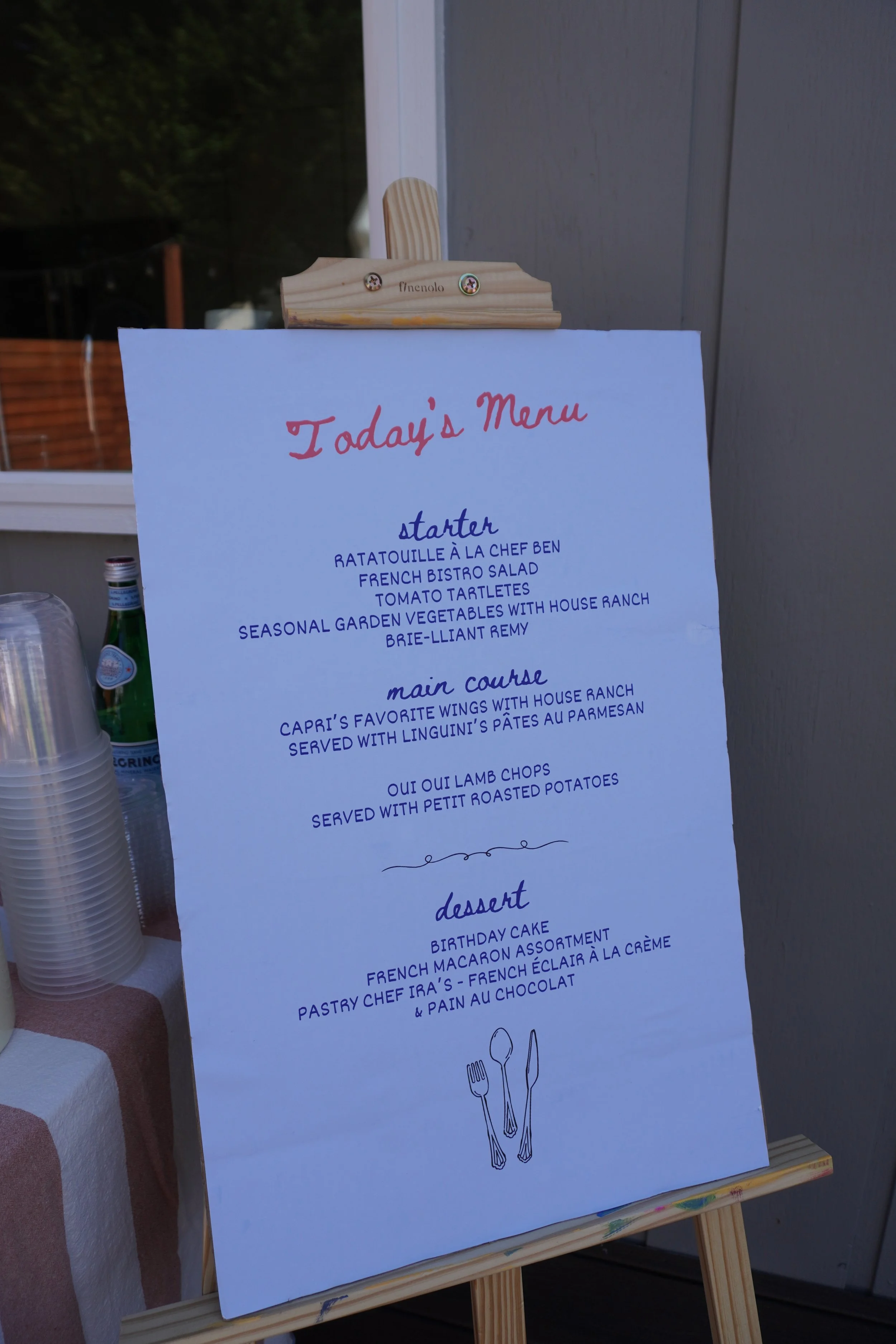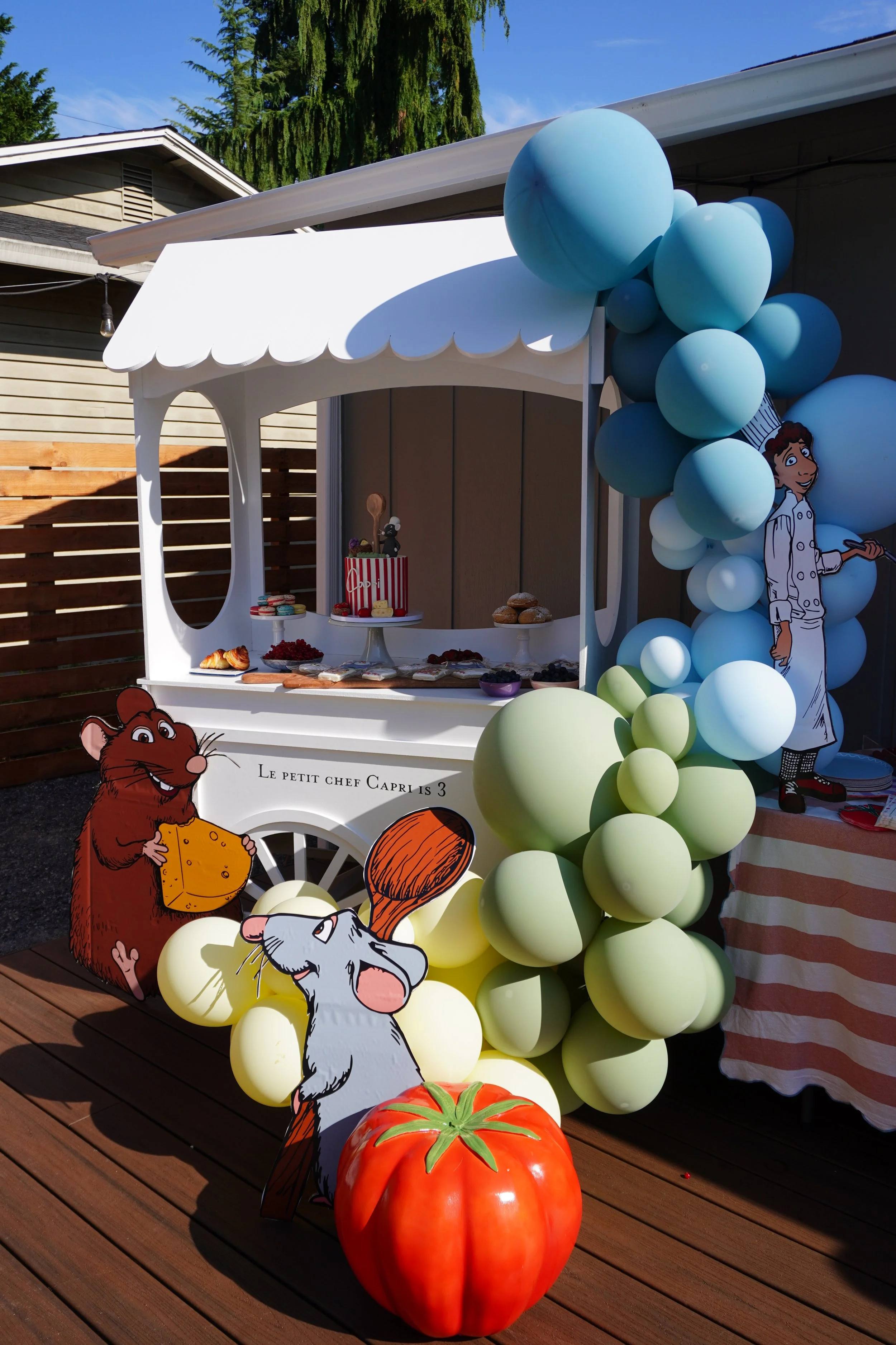 I love to do a moodboard before planning a party because I feel that it really helps me bring everything together and be so creative throughout the process. I sit down for like 15 minutes and just look through pictures, Pinterest and even think through all the things about her that I would want incorporated on her day. I pulled a bright color scheme that was inspired by cooking and different vegetables and ingredients. We have these huge heirloom tomatoes growing in our garden that made tomatoes the main ingredient of the day. My family loves to get involved in these parties for her and we LOVE to cook so this was our moment too. I had a lot of fun creating a curated menu with Capri's grandparents on what we will cook inspired by French cuisine like ratatouille of course as well as her favorites like her grandpa's classic chicken wings ( the girl loves wings). We love to do as many things homemade as we can and so grandma even made croissants and french eclairs for the party that were unreal!! It really is a whole family ordeal haha.