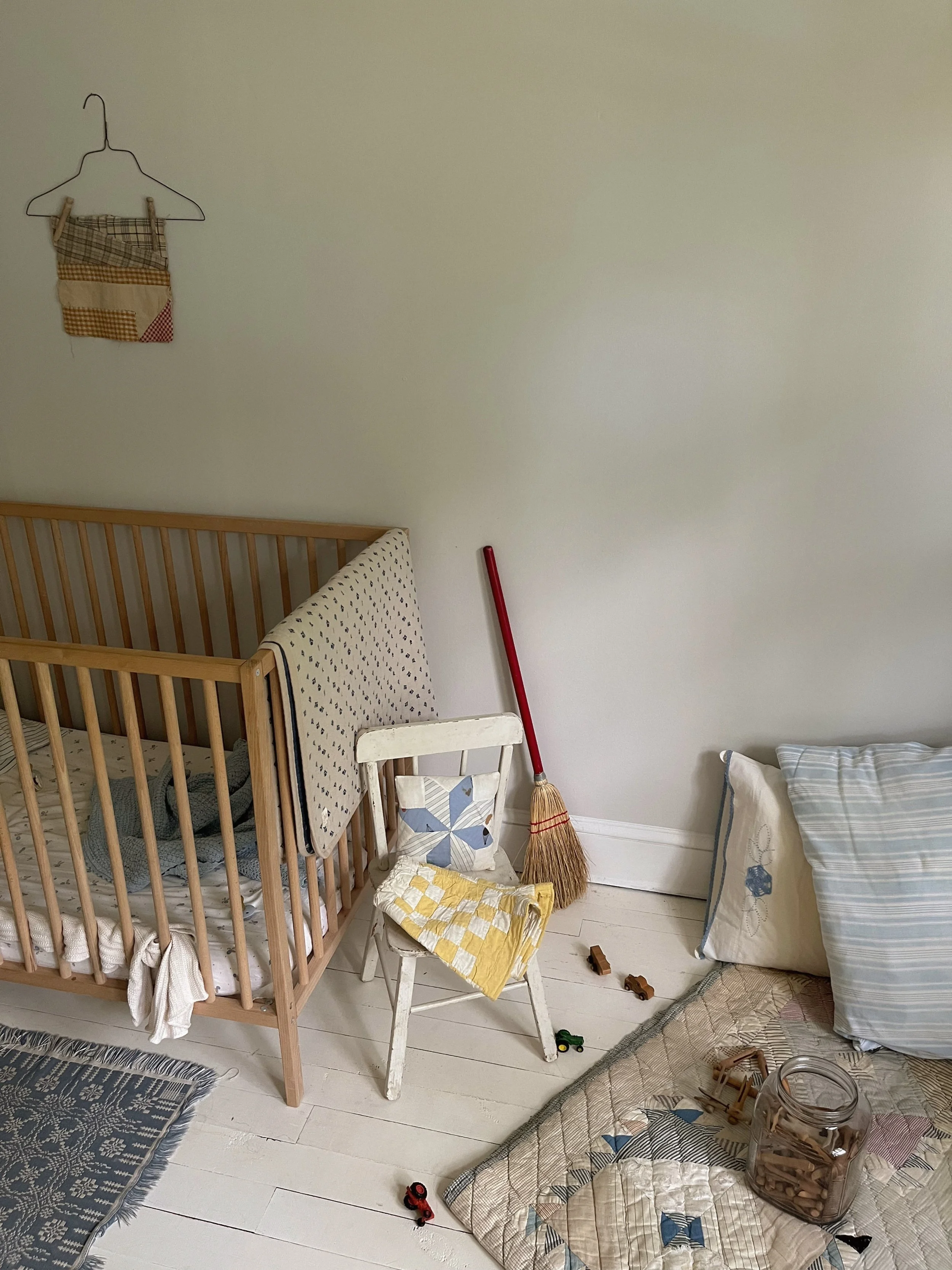 White painted floors, lived-in corners, and soft layers of texture make every room feel like a place where stories unfold. Clothes are gathered in gentle piles on the floor, books are tucked into wooden crates, and a cozy bed is piled high with quilts and handmade pillows.