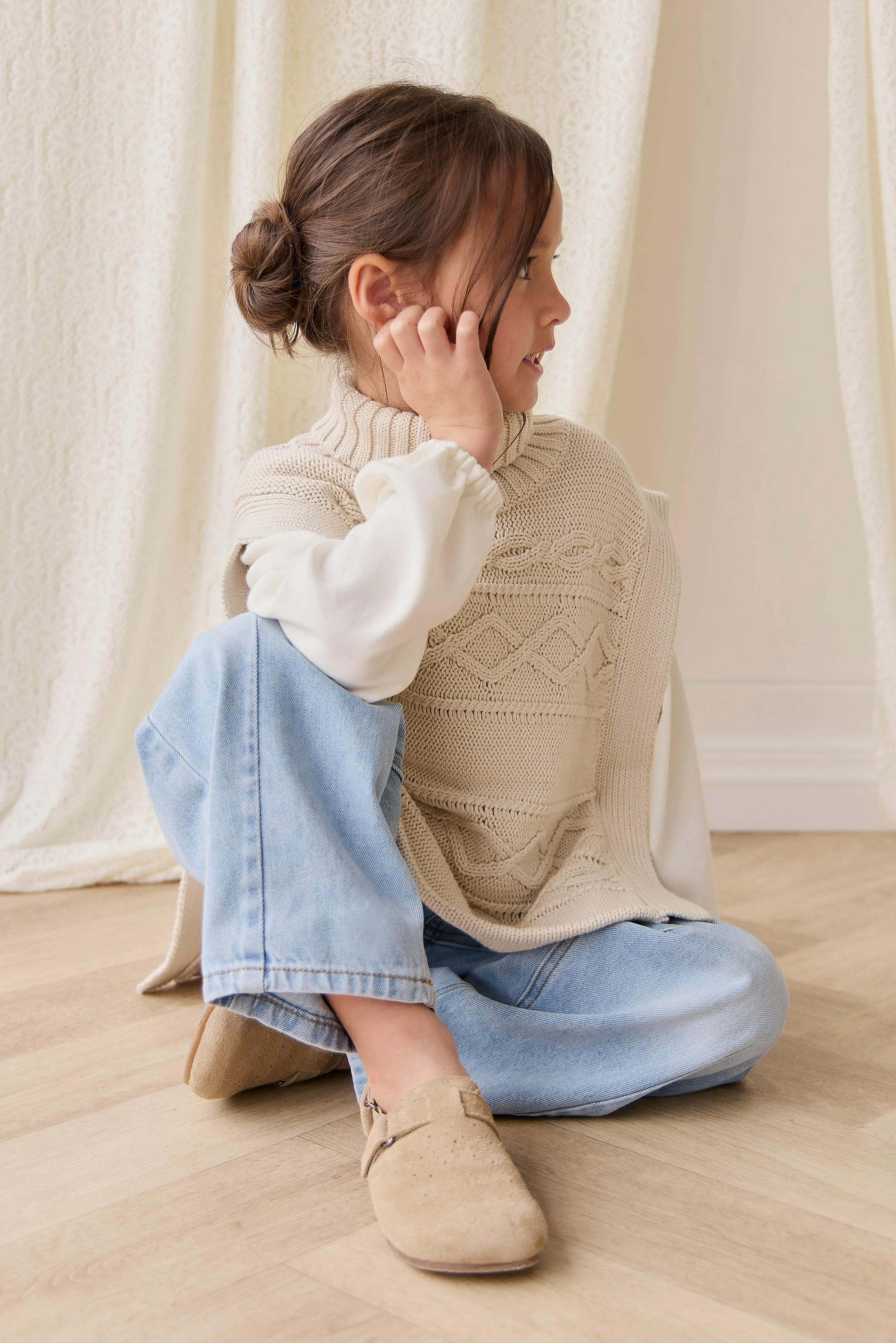 Launching Wednesday, November 5 at 4 PM PST, the Bonnie Collection brings together cozy textures, delicate details, and a palette that transitions perfectly from autumn afternoons to holiday gatherings. Expect classic cable knits, soft ribbed tops, flutter trims, and organic cotton essentials, each made to be loved, layered, and lived in.