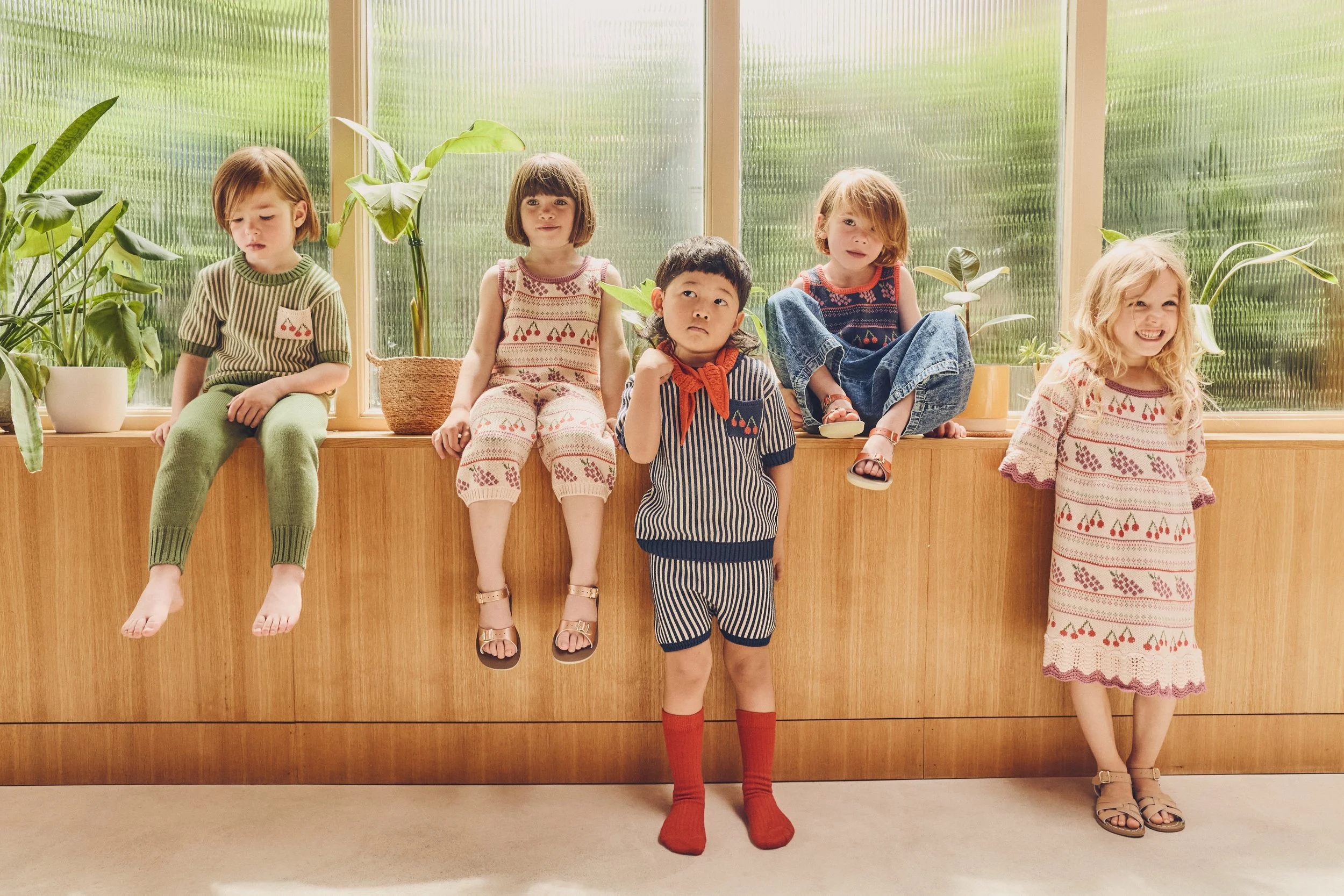 This season introduces light cotton knits, whimsical fruit motifs, soft stripes, and delicate jacquards inspired by slow spring days and outdoor picnics. From frill-trimmed baby sets and breezy knit tops to relaxed shorts and bonnets, the pieces feel both timeless and easy for everyday wear.